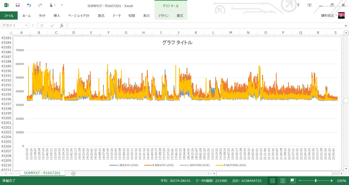 このデータを眺めていても何が何だか分かりませんが、excelを利用してグラフ 化するとよく分かります(下記グラフ:呼吸、体動の活動量を利用、活動量と は32768min~66536maxの間で変化します)。