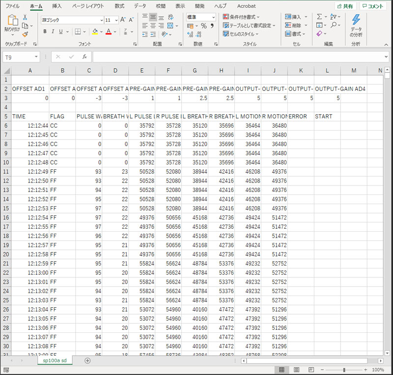 左記のCSVデータは弊社のセンサーから出力される脈・呼吸の参考値と脈・呼 吸・体動の活動量で、1秒ごとに更新したデータです。